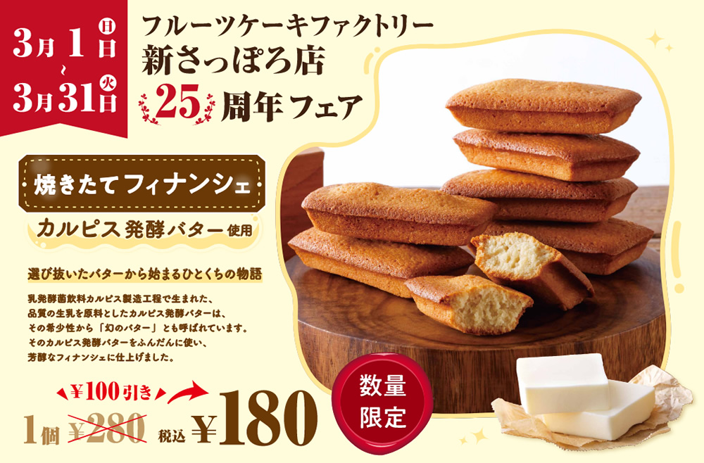カルピス発酵バター使用『焼きたてフィナンシェ』が、 1個 ¥280(税込)⇒¥180(税込)でご提供いたしております。 嬉しい100円引きとなっております!